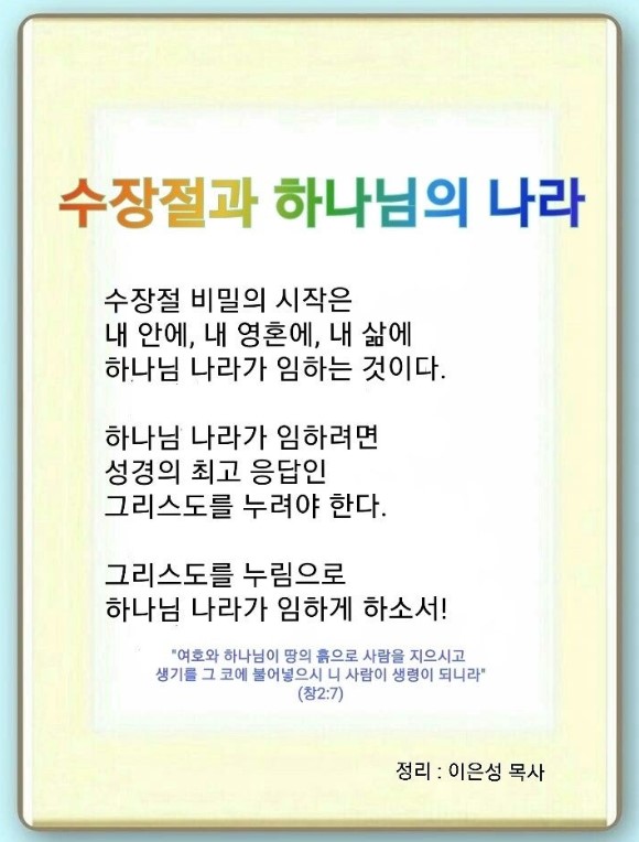 수장절의 비밀은 어디서 시작될까요? 내 안에,(창 1:27) 나의 영혼 속에,(창 2:7) 나의 실제 삶 속에(창 2:18) 하나님 나라가 임하는 것입니다.