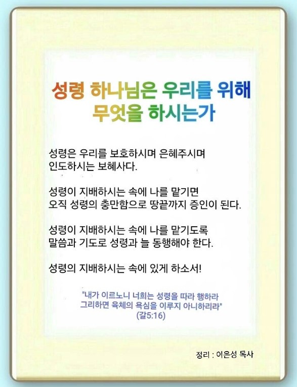 우리의 일은 성령이 지배하시는 속에 나를 맡기는 것입니다. 그리고 오직 성령의 충만함으로 땅끝까지 증인이 되는 것입니다.(행 1:6-8) 우리는 구원받았음에도 불구하고 자꾸만 육신과 세상의 생각을 따라갑니다.(갈 5:17) 그래서 성령과 늘 동행하며 예수 이름으로 모여야 합니다.(마 18:18-20)