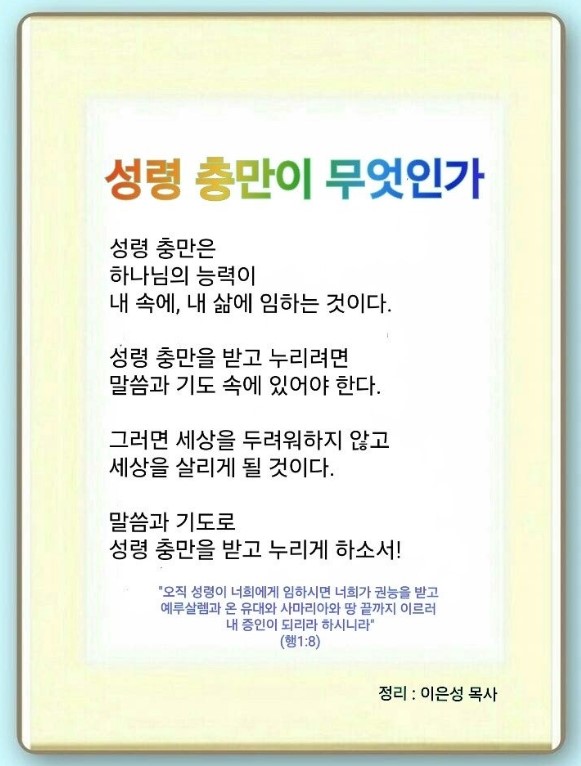 예수께서 보혜사 성령을 보내사 우리와 영원토록 함께 있게 하겠다고 하셨습니다.(요 14:16-17) 생명의 성령의 법이 죄와 사망의 법에서 우리를 해방했습니다.(롬 8:2) 성령으로 항상 함께하겠다고 약속하셨습니다. 그래서 성령의 충만한 능력이 말씀으로 내게 계속 와야 됩니다.