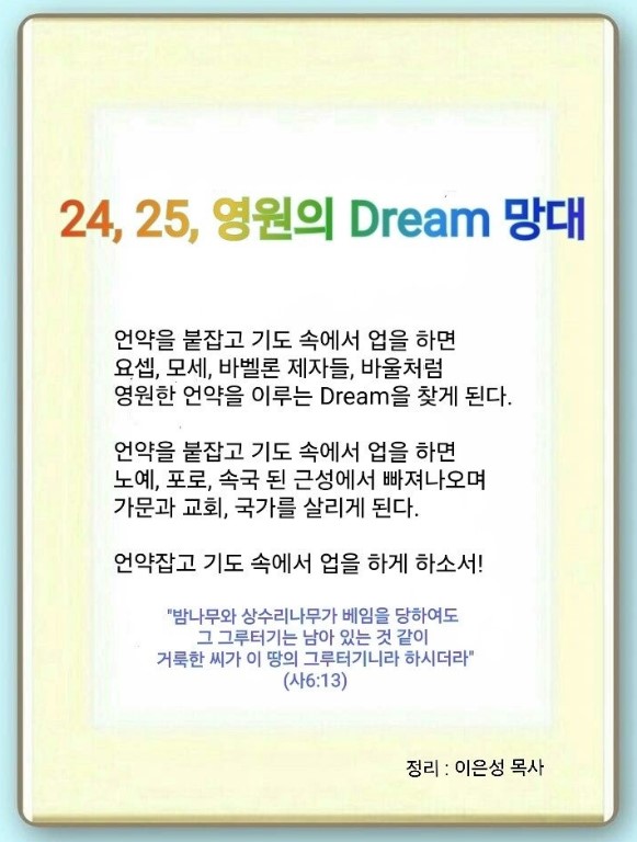 호흡과 함께 기도의 리듬을 타면 굉장히 행복해집니다. Dream은 24, 25, 영원 속에서 나와야 합니다. 기도를 계속하는 중에 응답이 오면 Dream이 확실해지고 24, 25, 영원의 망대가 만들어집니다. 우리의 꿈은 영원 속에 있는 오늘이기 때문에 오늘 나에게 큰 어려움이 왔다면 영원이라는 시간표와 내 평생의 시간표 속에서 그것을 보면 됩니다. 그러면 답이 빨리 나오고 힘이 생깁니다. 성경 속 렘넌트들의 특징은 언약과 비전 속에서 나온 꿈과 영원한 배경을 가지고 있었다는 것입니다. 요셉과 모세, 사무엘과 다윗, 엘리사, 이사야, 다니엘과 세 청년, 에스더가 대표적인 인물입니다. 예수께서도 성취될 Dream을 주셨습니다.(마 28:16-20, 막 16:15-20, 행 1:8) 이 언약을 붙잡고 기도 속에서 학업을 계속하고 있으면 영원한 언약을 이루는 Dream이 잡히게 됩니다.
