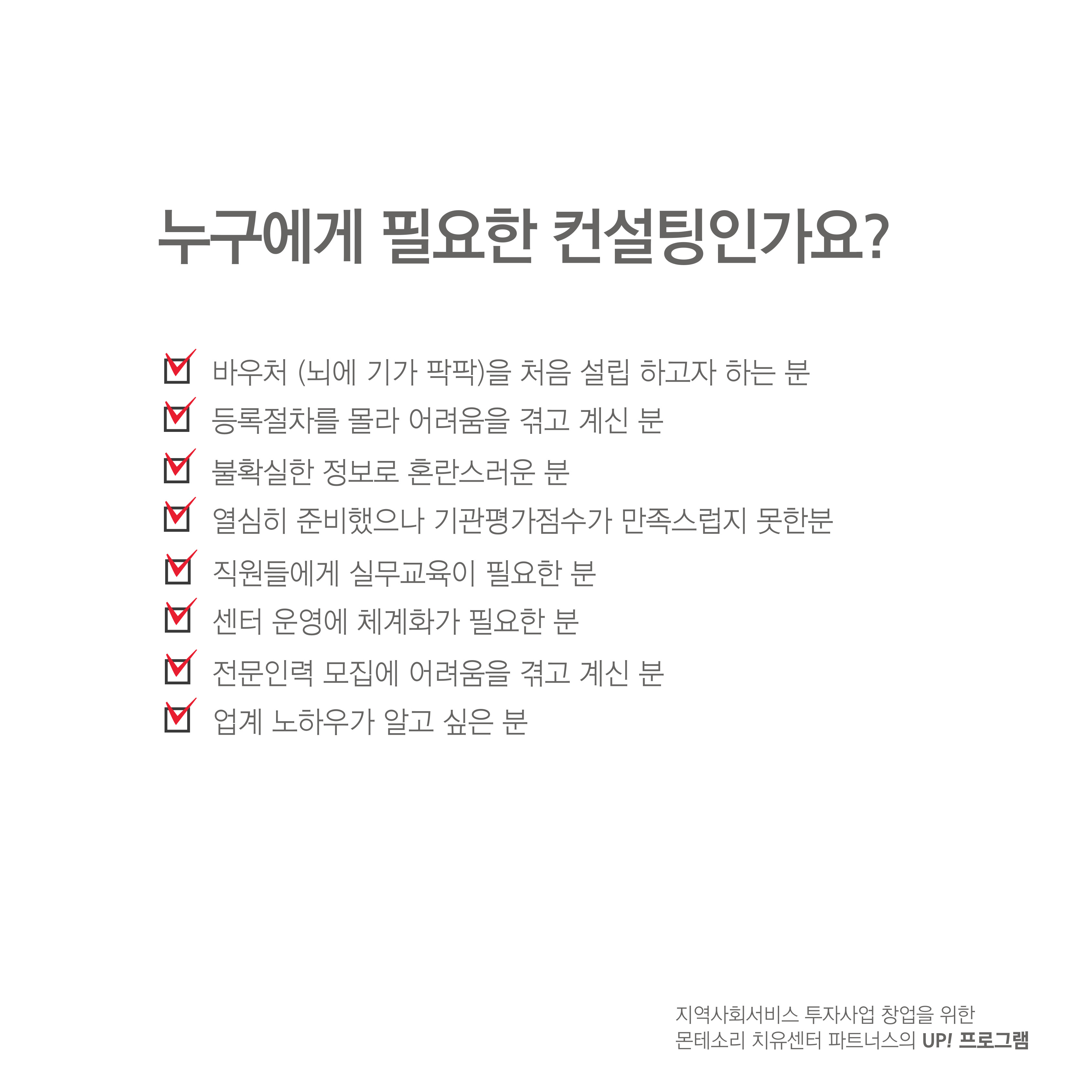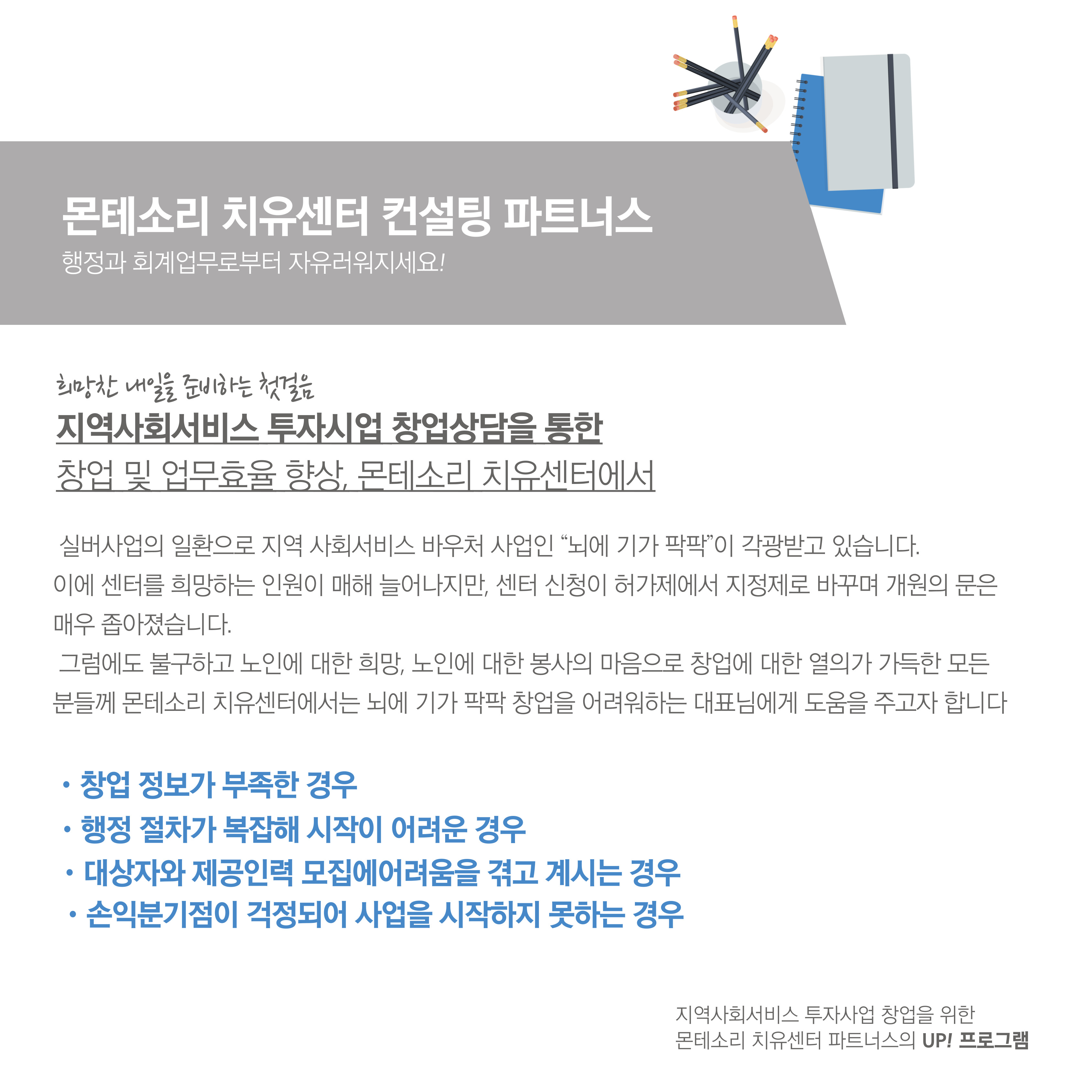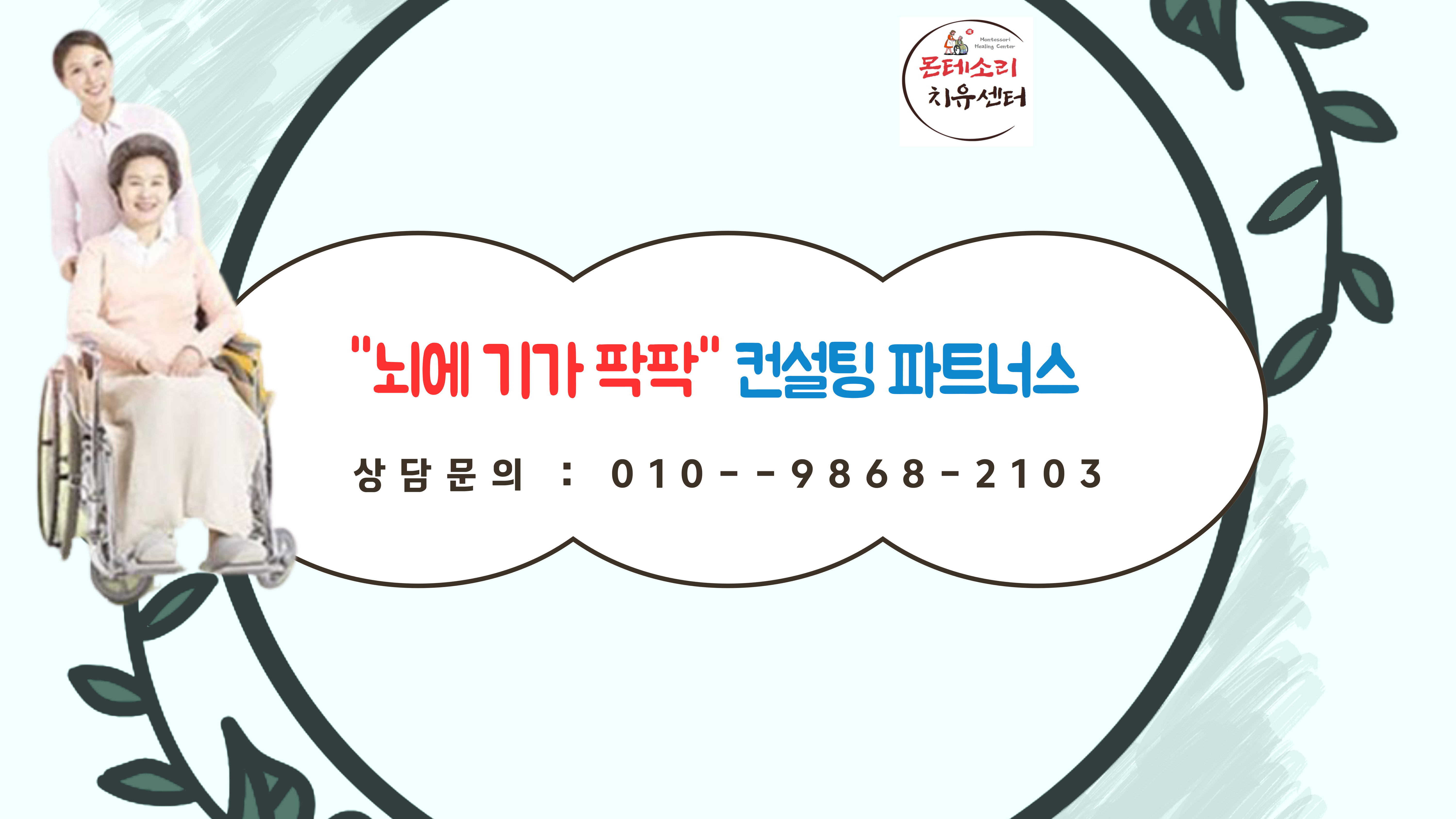 컨설팅 파트너스 뇌에 기가 팍팍 컨설팅 파트너스(몬테소리 치유센터) kkkk1377 2024. 7. 23. 01:52 반응형 몬테소리치유센터는-코람대오의 바탕으로 호스피스돌봄, 치매예방(뇌에기가 팍팍)등을 전문으로 하는 전문센터입니다. 뇌에 기가 팍팍 컨설팅 파트너스(몬테소리 치유센터) 상담문의 : 010-9868-2103 반응형 공유하기 게시글 관리 몬테소리 치유 센터 저작자표시 비영리 변경금지 (새창열림)