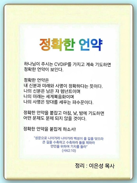 하나님께서는 미래를 말씀하셨습니다. 언약이 정확하다는 것은 내 신분과 미래가 정확하다는 뜻입니다. 성령으로 잉태된 자만 사탄과 지옥 배경, 재앙을 막을 수 있다고 하셨습니다.(사 7:14) 하나님의 말씀은 영원히 설 것이라고 하셨습니다.(사 40:1~31) 앞으로 나타날 하나님의 능력에 대해 말씀하셨습니다.(사 43:16~19) 그 능력의 빛이 임하였으니 일어나 빛을 발하라고 하셨습니다.(사 60:1~22)