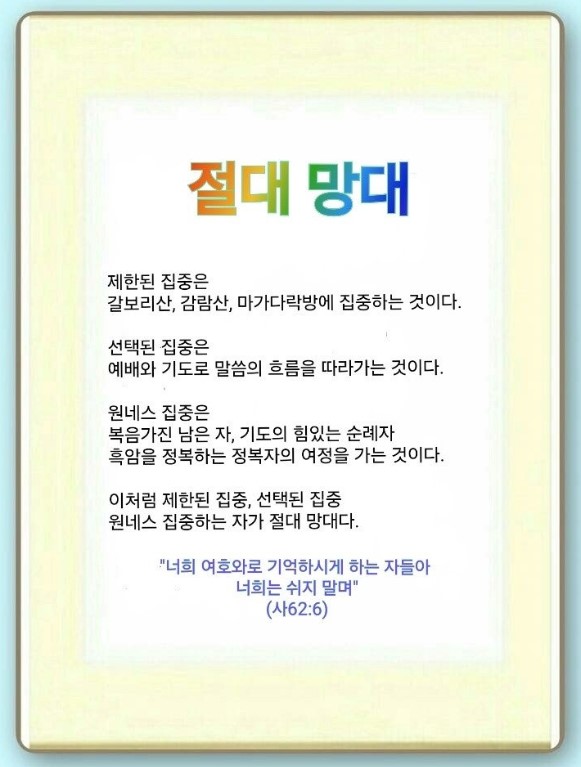 완전히 제한된 집중시간을 가져서 갈보리산과 감람산, 마가 다락방을 체험해야 됩니다. 그리스도, 하나님의 나라, 오직 성령으로만 공중 권세 잡은 자를 무너뜨릴 수 있습니다. 성삼위 하나님의 능력과 시공간 초월하는 보좌의 능력, 3시대를 살리는 능력으로 가능합니다.