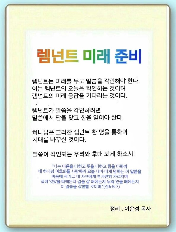 렘넌트들이 기억해야 될 것이 있습니다. 내가 지금 어디에 있는지를 확인하고, 응답이 어떻게 오고 있는지도 확인해야 합니다. 렘넌트는 어떤 미래를 준비해야 할까요? 가장 중요한 것은 마음을 다하고 뜻을 다하고 힘을 다하여 우리 하나님 여호와를 사랑하는 것입니다. 그리고 말씀을 마음에 새기고 후대에 부지런히 가르쳐서 각인시키는 것입니다.(신 6:4-9) 이것이 렘넌트가 사는 길입니다.