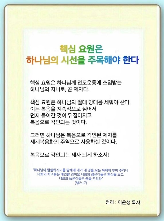 핵심 요원들은 하나님의 절대 망대를 세워야 합니다. 먼저 기도의 절대 망대를 만들기 위해서는 요 19:30에서 시작해야 합니다. 예수께서 하신 말씀이(마 28:16-20, 막 16:15-20, 행 1:1-8) 기도의 절대 망대입니다. 하나님 나라의 일이 이루어지는 것이 응답의 기준이고, 방법은 마가다락방의 성령의 역사입니다. 그러면 7망대와 7여정이 보이게 되고, 미리 CVDIP가 보여집니다. 그다음 우리의 업에(300%) 전문성과 시스템, 현장성이 있는 절대 망대를 만들어야 합니다. 교회에도 절대 망대를 만듭니다.(세 가지 뜰: 치유의 뜰, 이방인의 뜰, RT의 뜰) 이렇게만 하면 성경에 있는 전도운동이 그대로 일어납니다.(다락방 – 전문교회) 마지막으로 목회자들이 마음껏 전도하고 선교하도록 도와야 합니다.