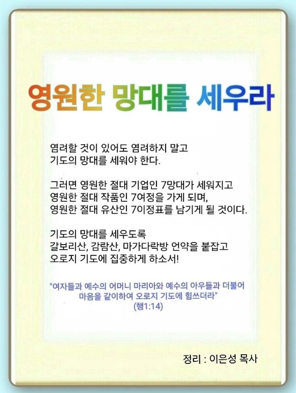 성경에 예언된 최고의 사건은 그리스도의 십자가 처형과 부활입니다.(고전 15:3-4) 이 그리스도께서 감람산에서 영원한 절대 기업을 40일 동안 설명했습니다.(7망대) 기도는 시공간을 초월하기 때문에 이것을 기도하면 237을 살리고, 우리와 우리 후대에 하나님의 증거가 일어나게 됩니다.(시 90:14-17)