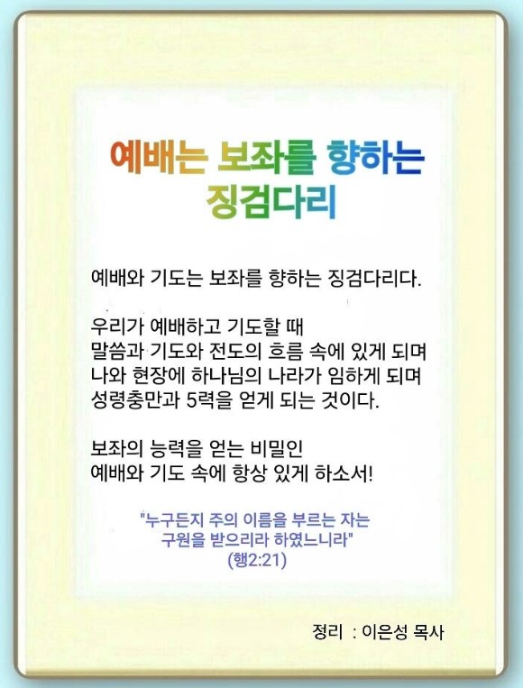 예배와 기도는 보좌를 향하는 징검다리입니다. 우리가 예배하고 기도할 때 하나님 나라의 일이 이루어지고 있습니다.(마 6:33, 12:28-29, 행 1:3, 요삼 1:2) 그렇기 때문에 우리는 예배와 기도의 가치를 알아야 합니다. 예배와 기도에는 중요한 흐름이 있습니다. 말씀과 기도, 구원에 대한 전도의 흐름입니다. 이때가 세계를 움직이는 최고의 시간이 됩니다. 또 다섯 가지 권능을 약속하셨습니다. 위에서 내리는 힘인 영력과 하늘에서 내리는 지력, 영육간에 하나님이 허락하시는 체력, 빛의 경제를 회복하는 경제력, 237-5000종족 살릴 인력입니다. 예배를 잘 누리고 있으면 중요한 것이 나옵니다.