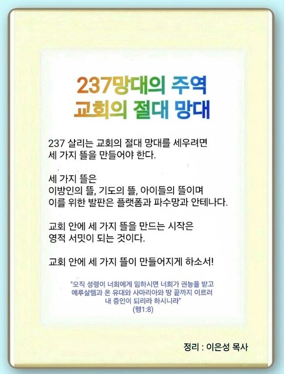 예수께서 237망대의 주역은 오직 성령으로 된다고 하셨습니다. 237망대의 주역이 되기 위해서는 예수께서 공생애 3년과 감람산에서 40일 동안 가르치신 것을 해야 합니다. 초대교회 성도들은 그것을 가지고 마가 다락방에 내려왔습니다. 그것이 최고의 절대 망대입니다. 행 1:8 속에는 기도뿐만 아니라 전도도 들어 있습니다. 전도는 예수께서 주신 언약을 가지고 명령하신 그곳에 있는 축복을 누리는 것입니다. 이 축복을 경험한 후유증이 전도입니다. 청년들은 교회 안에 세 가지 뜰을 만들어서 교회의 절대 망대를 세워야 합니다. 예수께서 말씀하신 절대 언약 7가지 비밀 속에서 나오는 문화로 전도와 선교를 할 수 있고 세계를 바꿀 수 있습니다. 이 문화가 세 가지 뜰의 시작입니다. 이것을 알고 사탄은 네피림 문화를 만들었습니다. 청년들이 기도를 안다면 하나님은 문화를 맡기실 것입니다.