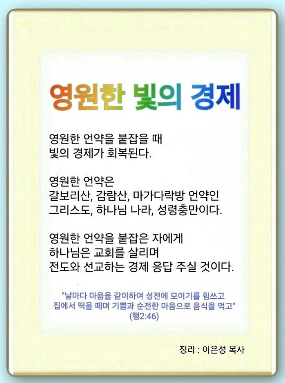 하나님께 감사드립니다. 초대교회 있는 빛의 경제를 회복하는 모든 성도님들이 되게 해 주옵소서. 우리 중직자분들이 빛의 경제를 회복하는 주역이 되게 해 주옵소서. 렘넌트들이 빛의 경제를 회복하여 미래 살리는 주역이 되게 하옵소서. 주 예수 그리스도 이름으로 기도합니다. 아멘.