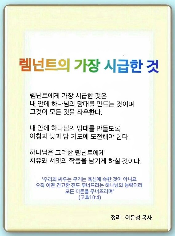 아침에 7망대·7여정·7이정표를 가지고 기도로 하나님의 망대를 세워야 합니다. 처음에는 아무것도 아닌 것처럼 보이지만, 나중에는 굉장한 것이 됩니다.