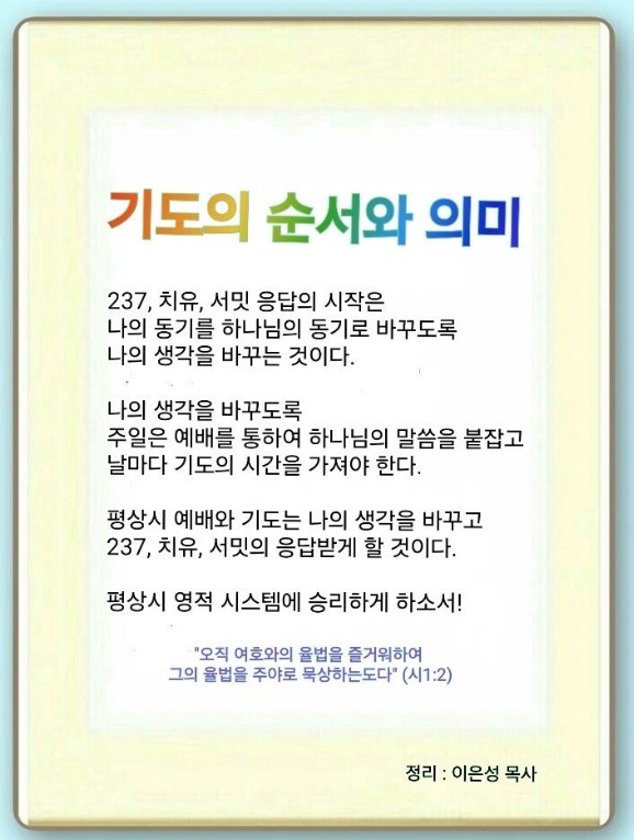 금토일 시대에 응답받으려고 할 때, 가장 중요한 것이 생각 바꾸기입니다. 예수께서 공생애에 설명하신 것은 전부 생각 바꾸기였습니다.(마 5, 6, 7, 10, 13장) 나의 동기를 하나님의 동기로 바꿔야 하고, 본격적으로 세 가지 뜰을 해야 합니다. 예수께서 마지막 강단에서 나와 세계를 변화시킬 수 있는 15가지와(3·9·3) 7미션, 7여정을 설명하시고, 오직으로 땅끝까지 증인이 될 것을 약속하셨습니다. 이것이 237, 치유, 서밋입니다. 개인에게 237, 치유, 서밋이 24, 25, 영원이 되어야 합니다. 이 시스템이 땅끝입니다. 토요일에 아이들과 모든 중직자들이 예수께서 말씀하신 깊은 집중의 시간을 가져야 합니다. 이것은 세계를 바꾸는 시간이 될 것입니다.
