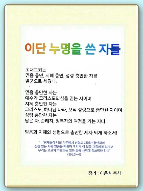 사도행전 6:1-7 / 형제들아 너희 가운데서 성령과 지혜가 충만하여 칭찬 받는 사람 일곱을 택하라 우리가 이 일을 그들에게 맡기고 우리는 오로지 기도하는 일과 말씀 사역에 힘쓰리라 하니 (3-4)
