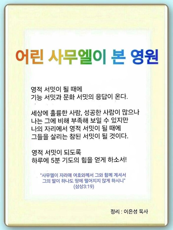 어린 사무엘이 본 영원이다. 렘넌트들이 이렇게(삼상 3:19) 되면 제대로 응답을 받은 것이다. “사무엘의 말이 한마디도 땅에 떨어지지 아니했다.” 이 정도면 사실 은 서밋이다. 여러분이 사회