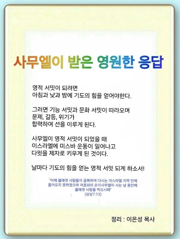 렘넌트가 가는 곳에 흑암이 결박됩니다. 그래서 사무엘이 전 백성을 미스바로 모은 것입니다. 이때 블레셋이 무너졌습니다. 그리고 이스라엘 전역을 순회하면서 성막운동을 회복시켰습니다.