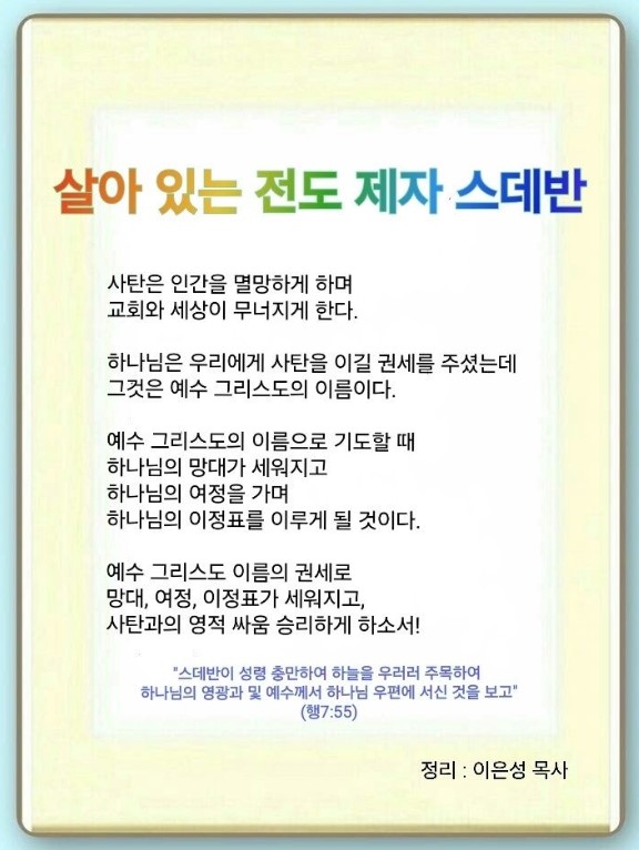 사탄은 전쟁을 일으키거나 자살하고, 살인하게 합니다. 이 사탄을 이길 권세를 교회에만 주셨습니다. 그런데 교회는 힘이 없고 먹고사는 것만 걱정합니다. 여기서 빨리 해방되어야 됩니다. 그리스도께서 감람산에서 세상 살리는 비밀을 주셨습니다.(행 1:3, 8) 하늘 보좌의 능력이 나의 망대가 되고, 이 망대가 여정이 되는 것을 설명했습니다. 그리고 특별 망대를 세우는 이정표를 말씀하셨습니다. 파수꾼의 망대가 마가 다락방입니다. 여기서 능력이 임하는 세절기의 비밀과 5력이 나오고, 미래가 보입니다. 이때 영적 전염병과 재앙을 막을 직분자를 세웠습니다.(행 6장) 그 대표적인 인물인 스데반은 성령과 믿음, 지혜가 충만하여 위기에 빠진 이스라엘과 세계 살리는 일에 헌신했습니다. 전쟁, 살인, 자살하는 사람은 사탄에게 잡혔기 때문에 우리는 영적인 힘을 가지고 기도해야 됩니다.