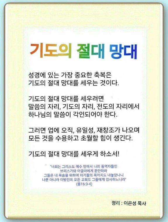 성경에 있는 가장 중요한 축복은 기도의 절대 망대를 세우는 것입니다. 이것이 중직자 산업인의 마지막 사역입니다. 우리의 생각은 반드시 뇌와 영혼에 각인됩니다. 하나님 자녀의 생각은 보좌에도 각인됩니다. 이때부터 역사가 시작됩니다. 영혼에 각인된 것이 현장을 변화시키고, 보좌에 각인된 것이 세계를 움직입니다. 그래서 영적 망대부터 먼저 세워야 됩니다. 불신자는 영적 망대를 허상, 공상, 추상으로 생각합니다. 그러나 응답받을 사람에게는 실상입니다. 그리고 사탄의 함정, 틀, 올무를 완전히 무너뜨려야 됩니다.(마 12:28-45) 하나님의 말씀이 각인될 때 견고한 진이 무너집니다.(고후 10:4-5) 렘넌트를 키운 산업인들은 모두 절대 망대를 세웠습니다. 그때부터 CVDIP를 찾아냈는데 세계가 변하기 시작했습니다. 이것이 진짜 복음 가진 사람이 받을 축복입니다. 그러면 어떤 영적인 망대를 찾아야 될까요? 먼저 마음에 담아야 시작됩니다.