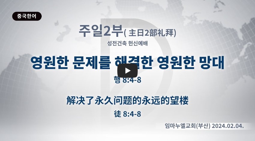 아무도 해결하지 못한 영원한 문제가 있습니다. 이것을 해결할 영원한 망대를 세워야 합니다. 그래서 세 가지 뜰, 금토일 시대, 237-5000종족, TCK들이 24, 25, 영원할 수 있는 교회를 지어야 합니다. 지금 정신질환자가 30%, 우울증이 40%로 급증했고, 심지어 학교에서 정신병 약을 먹는 어린아이의 수가 10%에서 44%로 늘어났습니다. 살인, 자살, 마약 문제가 터지고 있고, 영적 전염병이 전 세계에 재앙으로 퍼지고 있습니다. 언제 전쟁이 일어날지 모릅니다. 사탄이 광명한 천사로 나타나서 12전략으로 흑암 문화와 사탄 교회를 만들고 있고, 3~4차 산업까지 장악하기 시작했습니다. 중직자 빌립처럼 기도 응답받는 중직자 한 명만 나오면 역사가 일어납니다. 중직자 빌립은 무엇을 했을까요?