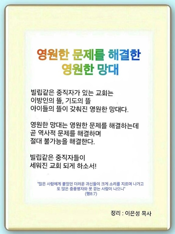 아무도 해결하지 못한 영원한 문제가 있습니다. 이것을 해결할 영원한 망대를 세워야 합니다. 그래서 세 가지 뜰, 금토일 시대, 237-5000종족, TCK들이 24, 25, 영원할 수 있는 교회를 지어야 합니다. 지금 정신질환자가 30%, 우울증이 40%로 급증했고, 심지어 학교에서 정신병 약을 먹는 어린아이의 수가 10%에서 44%로 늘어났습니다. 살인, 자살, 마약 문제가 터지고 있고, 영적 전염병이 전 세계에 재앙으로 퍼지고 있습니다. 언제 전쟁이 일어날지 모릅니다. 사탄이 광명한 천사로 나타나서 12전략으로 흑암 문화와 사탄 교회를 만들고 있고, 3~4차 산업까지 장악하기 시작했습니다. 중직자 빌립처럼 기도 응답받는 중직자 한 명만 나오면 역사가 일어납니다. 중직자 빌립은 무엇을 했을까요?