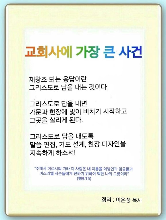 교회사에 가장 큰 사건 중 하나는 바울이 그리스도인으로 바뀐 것입니다. 유대인들이 복음을 깨닫지 못한 이유는 자기 힘으로 신앙생활을 하려고 하기 때문입니다. 하나님이 왜 나를 여기에 보냈는지, 왜 이 일을 맡기셨는지를 질문해야 합니다. 하나님이 주신 소명을 모르면 개인의 영적 문제도 고칠 수 없습니다. 그래서 우리는 10가지 발판을 정확하게 알아야 됩니다. 또 예수께서 하신 약속대로, 복음이 다 증거된 이후에 끝이 오기 때문에 모든 족속, 만민, 땅끝으로 가야 합니다. 하나님은 세상 끝날까지 항상 우리와 함께하신다고 하셨습니다. 강대국은 항상 복음 가진 자에게 굴복했습니다. 그래서 요한 칼빈은 역사를 보고 성경의 5대 교리를 말했습니다. 하나님은 우리를 “택한 나의 그릇”으로 부르셨습니다.