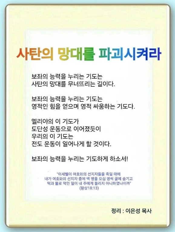눈에 안 보이는 영적 정복이 우리에게 남아 있습니다. 엘리야는 아합 왕이 죽이려 하자 도망가다가 지쳐서 로뎀나무 밑에 쓰러졌습니다. 천사를 통해 힘을 얻은 엘리야는 호렙산으로 달려갔습니다. 굴속에서 기도하다가 하나님의 음성을 듣고 엘리사를 세웠습니다.(7천 명)