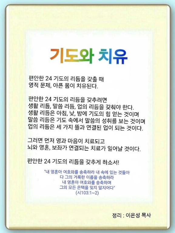 우리에게 그리스도를 보내사 구원해 주신 하나님께 감사드립니다. 우리 삶에 24할 수 있는 리듬이 생기게 하옵소서. 나를 살리는 집중을 통해 삶과 말씀, 업의 리듬을 찾게 하사 참된 치유의 비밀을 누리게 하옵소서. 예수 그리스도 이름으로 기도하옵나이다. 아멘.