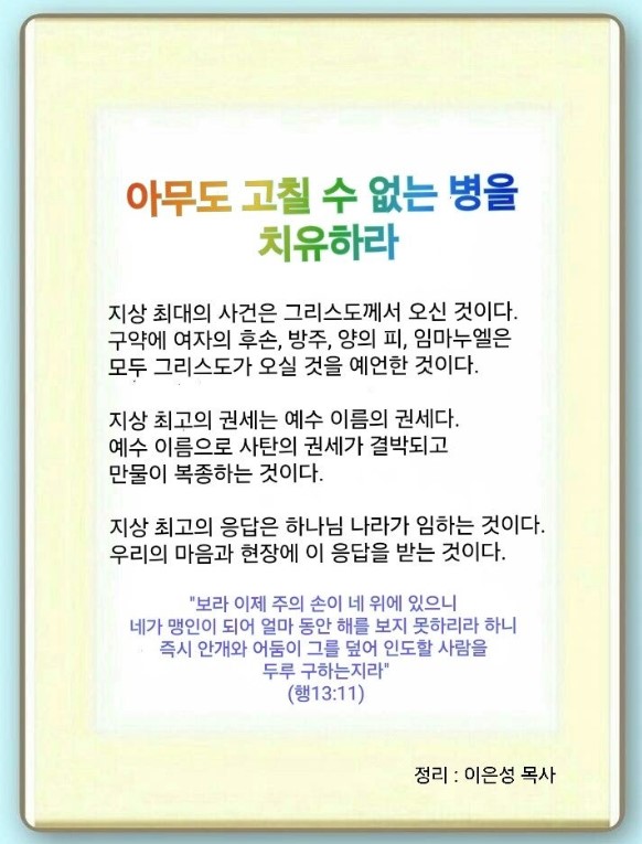 기도로 흑암 세력을 먼저 결박시켜야 합니다. 여기에 대한 증거가 렘넌트 7명과 초대교회와 바울에게 일어났습니다. 그런데 전 세계 교회는 이 비밀을 전혀 말하지 않고 있습니다. 이제 금토일 시대를 열어 치유에 집중해야 됩니다. 불치병자들이 영력을 키우는 기도와 호흡 기도, 음식과 운동에 집중할 수 있도록 도와야 합니다.