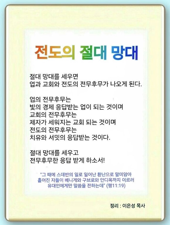 세계복음화를 시작한 안디옥교회에 전도의 절대 망대를 세웠습니다. 그러자 무속인과(행 13:5-12) 귀신 들린 자,(행 16:16-18) 불치병자를(행 19:8-20) 고치는 역사가 일어났습니다. 핍박이 일어났지만, 더 큰 하나님의 역사가 일어났습니다.(행 12:1-25) 예수께서 40일 동안 하나님 나라의 일을 말씀하셨습니다. 오직 성령이 임하도록 기도하며 기다리라고도 하셨습니다. 우리는 기도가 삶에 리듬이 되도록 7망대와 7여정, 이정표를 가지고 기도해야 합니다. 그러면 CVDIP가 응답으로 오고 기도 제목이 만들어집니다. 이것을 24 하면 하나님 나라의 일이 따라오고, 영원의 작품을 남기게 됩니다. 지금 3단체는 명상운동과 기운동, 초능력으로 문화를 만들어서 전 세계를 파고들고 있습니다. 그래서 우리가 이 기도를 회복하면 절대 망대의 포인트인 전무후무가 나옵니다.