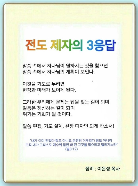 우리는 답을 찾고 답을 가지고 살리러 가는 제자입니다. 가정 문제,(창 37:1-11) 국가 문제,(출 3:1-18) 교회 문제,(삼상 3:1-19) 사회 문제,(시 23:1-6) 우상 문제,(왕하 2:9-11) 후대 문제,(사 6:1-13) 미래 문제에(행 1:8) 답을 가지고 가는 것입니다.