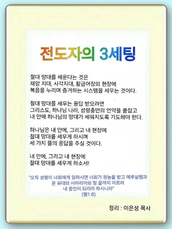 앞으로 올바른 복음으로 치유하는 시대, 다민족 시대, 렘넌트들이 경제 현장에 바로 뛰어드는 시대가 옵니다. 그래서 우리는 세 가지 뜰을 제대로 준비해야 합니다. 정확한 언약이 내게 담기면 그때부터 시작이 되고 하나님이 원하시는 절대 망대가 서게 됩니다. 이때 사람들이 올 수밖에 없고 하나님이 축복할 수밖에 없는 플랫폼과 파수 망대, 안테나가 서게 됩니다. 요셉은 여자의 후손이 뱀의 머리를 깰 것이라는 것을 알아들었고,(창 3:15) 모세는 피 제사가 이스라엘을 해방시킬 것임을 알았습니다.(출 3:18) 흑암 세력을 꺾는 그 이름을(사 7:14 임마누엘) 다니엘이 잡았습니다. 베드로는 예수가 그리스도임을(마 16:16) 고백했고, 바울은 오직 의인은 믿음으로 산다는 말씀에(롬 1:16-17) 답을 냈습니다. 절대 망대를 세운 것입니다. 우리는 재앙 지대, 사각지대, 황금어장에 절대 망대를 세워야 합니다. 먼저 기도로 내 안에 하나님의 절대 망대가 서게 해야 합니다.