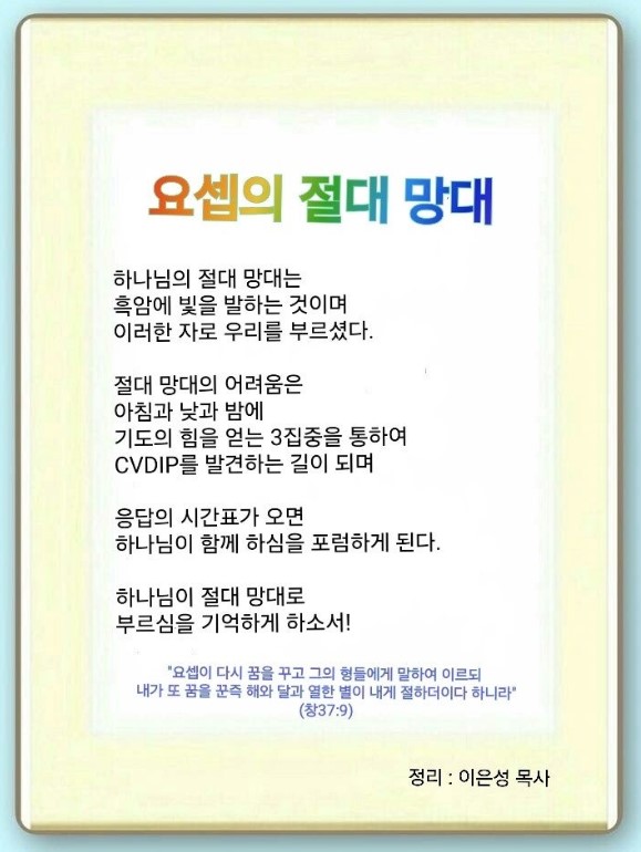요셉이 어려움 속에서 가장 잘한 것은 CVDIP를 발견한 것입니다. 요셉은 언약을 발견하고, 비전과 꿈을 찾았습니다. 어떻게 하면 된다는 이미지와 하나님의 세계복음화의 작품도 다 찾았습니다.