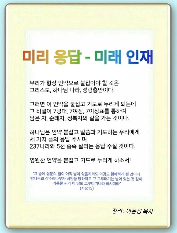 예수께서 갈보리산에서 사탄과 지옥, 재앙을 다 끝내시고,(요 19:30) 감람산에서 40일 동안 하나님 나라의 일을 설명했습니다.(행 1:1-8) 그 언약을 잡고 마가 다락방에 모였는데 행 2:1-47의 응답이 왔습니다. 여기서 나온 7망대, 7여정, 7이정표로 남은 자, 순례자, 정복자의 길을 가는 것입니다. 우리가 본부 메시지와(세계 흐름) 강단 메시지,(지역 흐름) 기도수첩 메시지로(현장 흐름) 24하면 25 응답이 오고 영원한 작품을 남기게 됩니다. 여기서 하나님의 시간표가 나옵니다. 산업인들이 미리 응답받는 방법은 세계를 바꿀 미래 인재를 키우는 것입니다. 이사야서에서 하나님은 렘넌트를 키우라고 하셨습니다.(사 6:13) 렘넌트 7명의 부모가 그 증거입니다.야곱,(창 37:11) 요게벳,(출 2:1-10) 이드로 장로,(출 3:1-20) 한나,(삼상 1:9-11) 이새,(삼상 16:1-13) 산업인 오바댜도 모든 흑암을 꺾을 인재를 키웠습니다.(왕상 18:1-15) 그루터기 언약을 알아들은 사람이 바벨론을 뒤집었고,(사 6:13) 바울은 회당으로 갔습니다.(행 17:1, 18:4, 19:8) 산업인들이 이것을 마음에 담으면 하나님이 인재를 보내십니다.