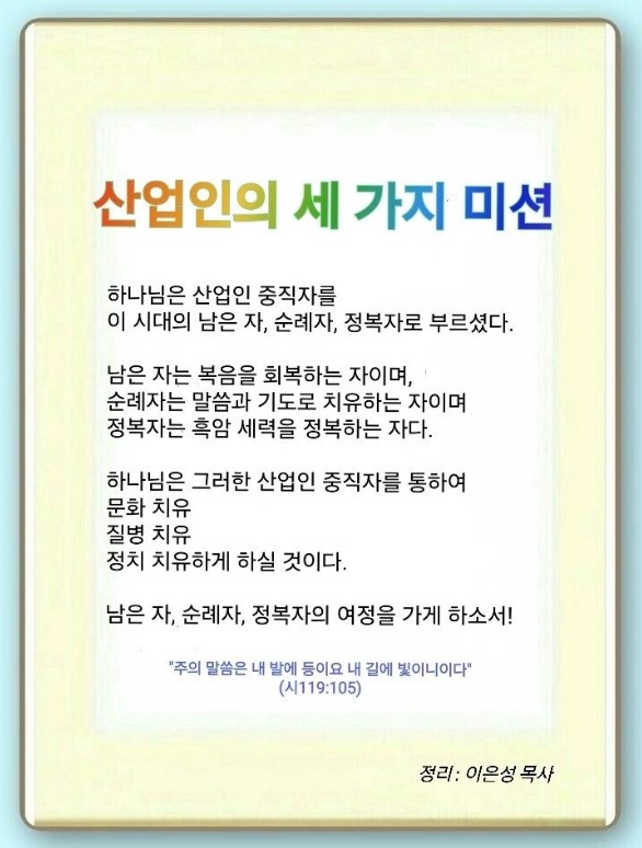 산업인들은 평안한 24를 누려야 합니다. 호흡을 편안하고 길게 하면서 기도하면 면역력과 함께 굉장한 영적인 힘이 생깁니다. 그때 7·7·7을 놓고 기도하면 하나님의 시간표를 알게 됩니다. 산업인들이 인재를 키우기 시작하면 하나님이 모든 것에 미리 응답을 주십니다. 그 전에 예수께서 복의 개념과(마 5-7장) 천국의 비밀,(마 13장) 교회를 바꾸라고 하셨습니다.(요 2:13-15) 가이사랴 빌립보와 변화산에서는 찾을 것을 말씀하셨습니다. 그리고 부활의 첫 열매가 되셔서 말씀하신 것을 찾아내야 합니다.(마 28:16-20) 마지막으로 예수께서 40일 동안 말씀하신 하나님 나라와 7망대, 7여정, 7이정표를 기도로 누려야 합니다. 이것을 회복하는 것을 남은 자라고 합니다. 남은 자는 치유하는 순례자의 길을 가야 합니다. 그러면 나머지는 다 따라옵니다.