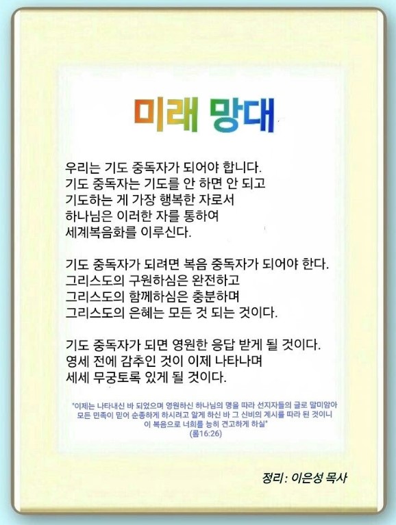 우리는 복음 중독자요, 기도 중독자가 되어야 합니다. 기도 안 하면 안 되고, 기도하는 게 너무 좋은 사람은 세계를 움직입니다. 그러면 하나님의 시간과 그 표가 보이고, 세계복음화의 응답이 옵니다. 237나라와 5000종족 복음화, 세 가지 뜰, 금토일 시대가 올 수밖에 없습니다. 하나님의 시간표 중에 가장 중요한 시간표는 미래의 망대입니다. 미래를 아는 사람은 모든 것이 캠프로 바뀝니다. 렘넌트 7명과 그 부모님, 그들을 가르친 지도자들은 확실한 미래를 가지고 있었습니다. 초대교회 사람들도 미래를 보았습니다. 예수께서 수천 년과 그 뒤의 걸 내다보는 답과 방법을 주셨기 때문입니다. 하나님이 사용하신 바울과 로마서 16장 사람들은 미래가 확실했기 때문에 흔들리지 않았습니다. 그러면 미래 망대를 만들 때 가장 중요한 것은 무엇일까요?