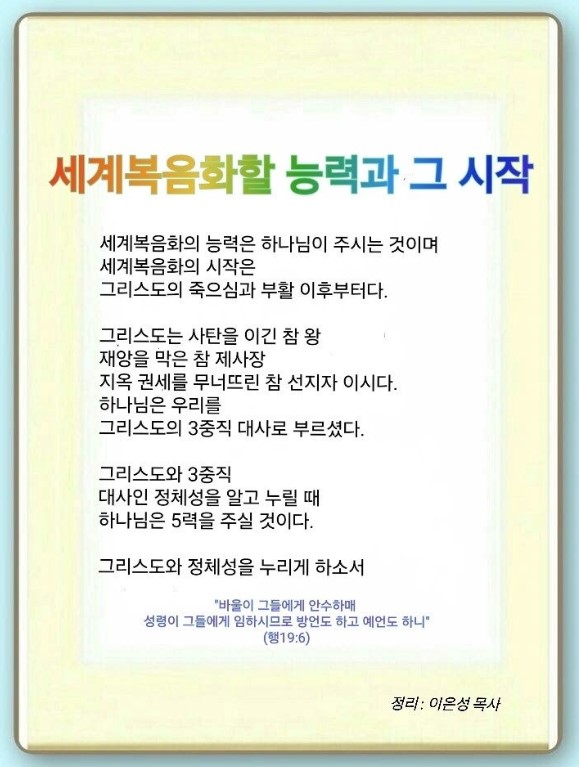 세계복음화의 능력은 하나님이 주시는 것입니다. 세계복음화의 시작은 그리스도께서 고난 당하시고 부활하신 이후부터입니다. 그리스도는 사탄을 이긴 참된 왕, 재앙을 막은 참 제사장, 지옥 권세를 무너뜨린 참 선지자입니다. 하나님은 우리를 3중직의 대사로 보내셨습니다. 이 사실을 믿으면 시스템이 만들어집니다. 예수께서는 제자들을 호렙산, 변화산, 감람산으로 불러서 집중하게 하셨습니다. 세상이 알지 못하는 5력을 갖추게 하기 위해서였습니다. 우리는 5력을 각인시키고 시스템을 만드는 집중 방법을 찾아야 합니다. 약점과 강점을 활용해서 기도하면 엄청난 망대가 만들어집니다. 요셉과 초대교회, 바울이 이 부분을 잘 누렸습니다. 이 응답을 받기 위해서는 복음과 복음 누리는 기도를 제대로 알아야 됩니다.