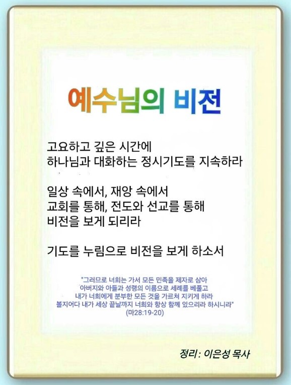 교회를 통해 비전을 보아야 됩니다. 예배 때마다 응답 된 것과 연결된 답을 찾아내면 됩니다. 마지막은 전도, 선교를 통한 비전입니다. 새가족에게 전도 미션을 주는 것은 아주 중요합니다.