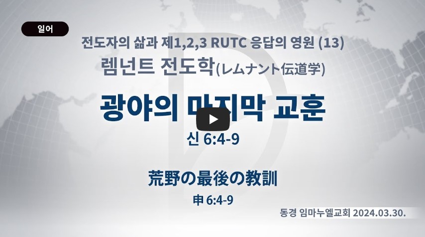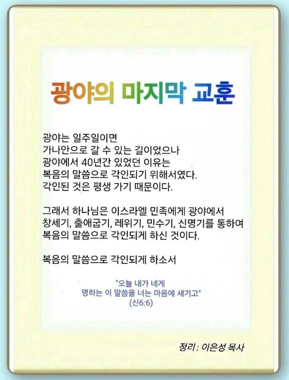 이스라엘 민족은 광야에 40년 동안 있었습니다. 일주일이면 갈 수 있는 길을 40년이나 있게 한 데는 이유가 있었습니다. 후대에게 중요한 교육을 하고 마지막 언약을 주어서 가나안 땅에 들어가게 하려고 한 것이었습니다. 렘넌트들은 광야에서 무엇을 알고 가야 할까요?