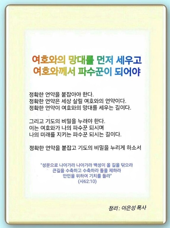 여호와의 언약이 나의 망대요, 여호와께서 나의 파수꾼입니다. 나의 미래가 여호와의 손에 있습니다. 이것을 놓고 항상 기도해야 합니다.