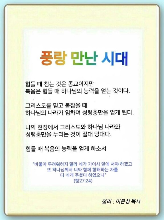 힘든 세상을 만났을 때 많은 사람은 참으라고 합니다. 하지만 그것은 종교입니다. 하나님은 우리에게 능력을 약속하셨습니다. 풍랑 중에 바울이 기도했을 때 여호와의 사자가 찾아와 말씀을 전했습니다. 바울은 “두려워 말라. 네가 가이사 앞에 서야 하리라.”라는 말씀을 통해 힘을 얻고 살아났습니다. 풍랑이 온 이유가 있습니다. 오랫동안 눈에 보이지 않는 공중 권세 잡은 자를 따르고 있었기 때문입니다.(엡 2:2) 그래서 예수께서 40일 동안 하나님 나라의 일과 보좌의 능력을 설명하셨습니다.(행 1:3) 이 오래된 영적 문제를 근본적으로 해결하는 영원한 망대를 세워야 합니다. 바울은 하나님이 이스라엘과 이방인과 많은 왕 앞에 세우기 위한 택한 그릇이었습니다.(행 19:15) 바울은 재앙과 복음 전해야 되는 이유를 알았습니다.(롬 16:25) 땅의 것으로는 세계복음화도 할 수 없고, 영적 문제도 해결할 수 없다는 것을 알았습니다.(빌 3장) 그래서 하나님이 주시는 영적 망대와 그 힘을 가지고 위기를 찾아갔습니다. 하나님은 우리에게 어떤 능력을 약속하셨을까요?