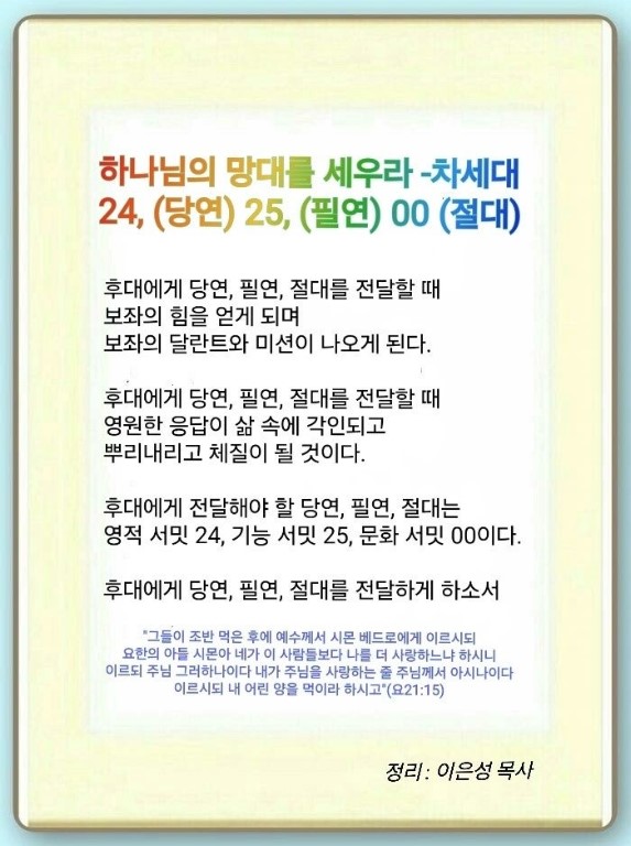 하나님의 망대를 세우라 –차세대 –24,(당연) 25,(필연) 00(절대)
