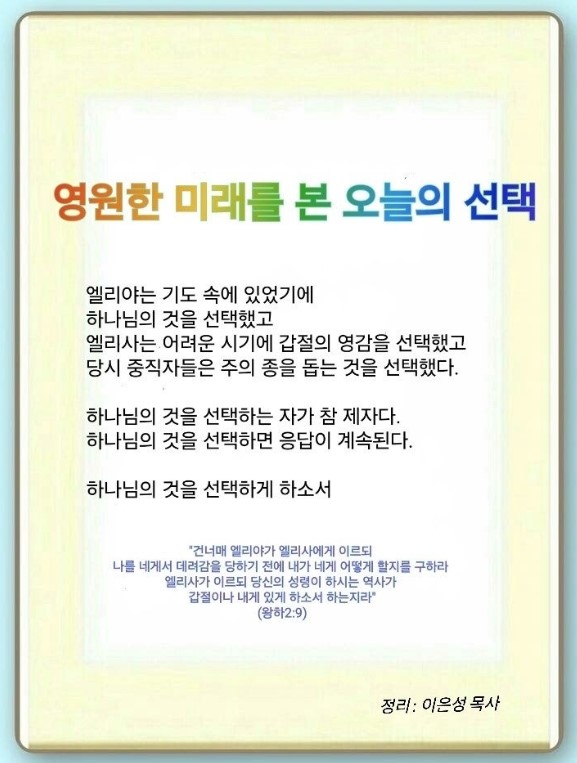 엘리사는 가장 어려운 시기에 가장 중요한 선택을 했습니다. 그는 죽음의 위기에 처한 엘리야의 제자가 되는 것을 선택했습니다.(왕상 19:19-21) 그리고 길갈, 여리고, 벧엘이 아닌 갑절의 영감을 선택했습니다.(왕하 2:9-11) 이렇게 하나님의 것을 선택한 엘리사는 도단성운동을 폈습니다.(왕하 6:8-24)