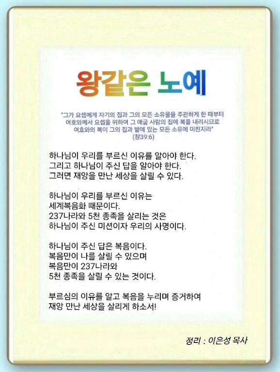 우리가 뭔가를 하기 전에 먼저 세 가지를 알아야 합니다. 첫째, 하나님께서 우리를 부르신 역사적인 이유를 알아야 합니다. 애굽에는 237나라가 있습니다. 그러나 5000종족으로는 들어갈 수 없기 때문에 이스라엘을 노예로 보내신 것입니다. 이 사람들이 복음과 기도, 시공간 초월을 알았기 때문에 237나라를 살릴 수 있었던 것입니다. 둘째, 네피림이 시공간 초월하여 영적인 전염병을 일으켜서 전 세계를 죽이고 있습니다. 셋째, 전 세계에 진짜 사이코패스 시대가 왔습니다. 그래서 우리는 하나님이 주신 답을(7‧7‧7) 가지고 있어야 합니다. 이것으로 24하면 하나님의 나라가(25) 임하고 영원이라는 작품이 남습니다. 그러면 미리 CVDIP가 보이고, 5000종족 살리는 주역이 됩니다. 그러면 왕 같은 노예로 간 요셉은 무엇을 했을까요?