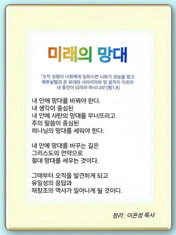 하나님이 우리를 파수꾼으로 부르셨기 때문에 절대 망대가 필요합니다. 이 하나님의 망대가 플랫폼이 됩니다. 하나님의 절대 여정이 파수 망대이고, 하나님이 주신 이정표가 안테나입니다.
