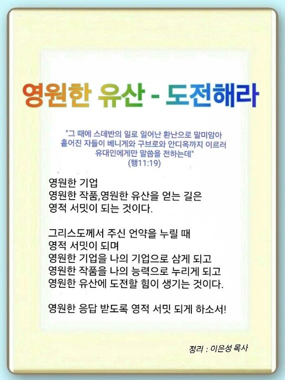 성경에서 말하는 영적인 것을 알아들어야 세계복음화할 수 있습니다. 하나님이 주시는 영원한 기업이 내것이 되어야 하므로 기다리면 됩니다. 약속한 것을 잡고 집중하면서 기다리는 것입니다. 그러면 영원한 작품을 만들 수 있습니다. 그리고 영원한 유산을 남겨야 하기 때문에 도전해야 합니다. 영적 세계는 하나님의 세계이기 때문에 무한대입니다. 7망대, 7여정, 7이정표가 영적기업입니다. 세 절기, 세 뜰, 금토일 시대가 영적 작품입니다. 영적 유산은 237- 5천 종족, 교회 밖에 영원한 망대를 세우는 것입니다. 그러려면 아무도 뺏을 수 없는 영적 서밋이 먼저 되어야 합니다. RT 7명이 먼저 영적 서밋이 된 것입니다.