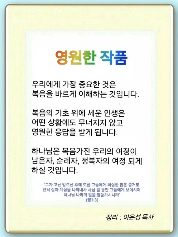 우리에게 가장 중요한 것은 복음을 바르게 이해하는 것입니다. 이 기초 위에 세운 영원한 망대는 어떤 상황에도 무너지지 않습니다. 그리스도께서 갈보리산, 감람산, 마가 다락방에서 영원한 문제를 해결한 것이 영원한 망대입니다. 그리스도 안에는 성삼위 하나님의 망대, 여정, 이정표가 있기 때문에 아무도 이길 수 없습니다. 이 축복이 나에게 영원한 기업이 되게 하면 끝입니다. 이것은 하나님의 약속이고, 하나님의 것을 우리에게 주시기 위한 것입니다. 이것이 달란트입니다. 이 사실을 알기만 해도 역사가 일어나고, 가지고만 있어도 아이들에게 전달됩니다. 하나님은 사탄의 12전략을 완전히 무너뜨리기 위해 모든 축복을 주셨습니다. 이 비밀은 창세 전에 하나님이 계획하신 것입니다. 또한 영세 전부터 계셨고, 성육신 하시고 부활하사 재림 주, 심판 주가 되실 그리스도의 이름을 주셨습니다. 이 사실을 알 때 영원을 알게 됩니다. 영원한 작품인 복음을 제대로 이해하면 치유가 일어나고 서밋을 세우게 됩니다.