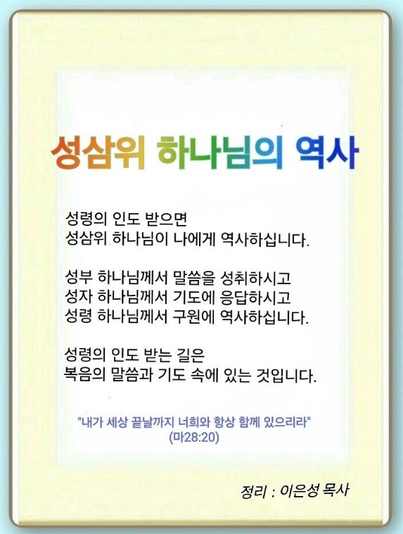 마태복음 28:16-20 / 그러므로 너희는 가서 모든 민족을 제자로 삼아 아버지와 아들과 성령의 이름으로 세례를 베풀고 내가 너희에게 분부한 모든 것을 가르쳐 지키게 하라 볼지어다 내가 세상 끝날까지 너희와 항상 함께 있으리라 하시니라 (19-20)