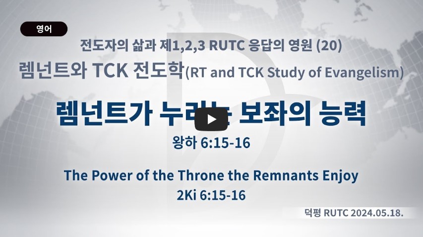 렘넌트들이 응답받으려면 TCK 쪽을 선택해야 합니다. 나의 문화와 환경, 생각과 안 맞는 곳으로 가는 것이 TCK입니다. 여기에 세계적인 답이 있습니다. 하나님께서는 언약 붙잡은 요셉과 모세를 TCK로 보내셔서 언약을 성취하시고, 사무엘을 TCK로 몰아가셔서 미스바운동의 지도자로 세우셨습니다. 다윗이 목동으로 혼자 있을 때 모든 것을 준비시키시고, 사무엘을 통해 답을 얻게 하셨습니다. 또한 엘리사를 가장 힘든 사람에게(엘리야) 보내어 가장 힘든 사명을 맡기셨습니다. 이 엘리사가 나중에 도단성운동을 폈습니다. 바벨론과 세계를 살리기 위해 다니엘과 세 친구를 TCK로 몰아가셨습니다. 바울은 회당과 서원에서 하나님 나라의 비밀을 설명했습니다.