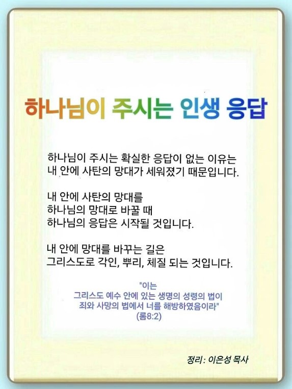 왜 하나님이 주시는 확실한 응답이 나에게 오지 않을까요? 왜 한국 교회는 70%가 미자립일까요? 왜 나는 집에서 생활하는 것이 힘들까요? 먼저 세 가지를 발견해야 됩니다. 절대 원인이 있습니다. 사탄이 아담과 하와를 무너뜨려 네피림으로 사로잡고, 바벨탑으로 무너지게 했습니다. 그래서 인간은 몸부림치지만, 계속 문제가 오고 재앙 속에 빠진 것입니다. 사탄의 망대가 세워졌기 때문에 절대 불가능인 것입니다. 죄와 사망의 법에 걸려 하나님의 법을 알 수도 없고 할 수도 없게 되었습니다. 그래서 하나님께서 절대 가능의 답을 주셨습니다. 그리스도 안에 있는 생명의 성령의 법이 죄와 사망의 법에서 너를 해방하였다고 했습니다. 이것은 무슨 뜻일까요?
