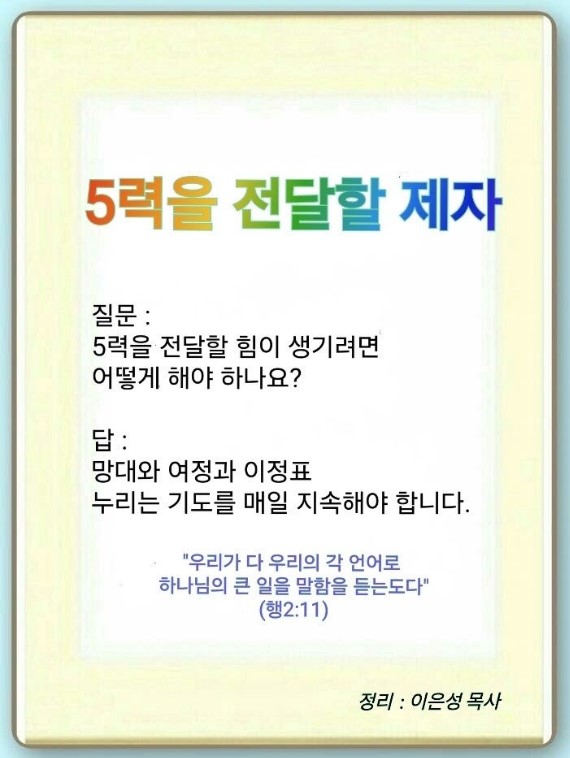5력은 하나님이 주시는 힘입니다. 하나님께서 우리에게 근원을 해결할 수 있는 힘을 주시는 것이 영력입니다. 하나님이 원하는 것을 볼 수 있는 힘을 주시는 것이 지력입니다. 세상 살릴 힘을 주시는 것이 체력입니다. 빛의 경제를 통해서 후대 살리는 힘을 주시는 것이 경제력과 인력입니다. 우리는 이 5력을 가지고, 누리고, 전달하는 제자가 되어야 합니다.