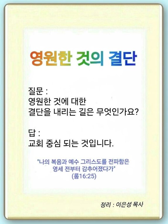 1영적으로 혹은 정신적으로 병든 사람은 스스로 해결할 수 없고, 때로는 가족들조차도 포기하게 됩니다. 하나님께서는 인간을 자기 형상대로 창조하시고 생기를 불어넣어 에덴의 축복을 주셨습니다.(창 1:27, 2:7, 2:18) 그런데 그 축복을 사탄에 의해 빼앗기게 되었습니다. 그래서 하나님은 영세 전부터 감추어 두셨던 비밀을 우리에게 주시겠다고 약속하신 것입니다.(롬 16:25-27) 따라서 우리는 영원한 것에 대한 결단을 내려야 합니다. 이 축복을 누리기 위해서 하나님은 성막을 짓도록 명령하셨습니다. 당시 성도들은 모든 삶의 중심을 성막에 두었습니다. 다윗은 평생의 중심을 성전에 두었으며, 세계를 살려야 되는 결단이 초대교회에 주어졌을 때 모든 시간의 중심이 교회에 있었습니다. 이때 빠뜨린 세 가지 뜰을 24·25·영원의 작품으로 남겨야 합니다. 그러면 ‘나의 복음’이 나옵니다. 이 복음은 영세 전부터 감추인 것으로 모든 민족을 살릴 신비의 계시입니다. 이 복음의 능력으로 견고해지면 세세 무궁토록 하나님께 영광을 돌리게 됩니다.