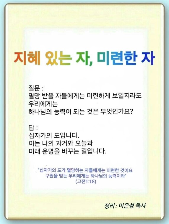 고린도전서 1:18-31 / 십자가의 도가 멸망하는 자들에게는 미련한 것이요 구원을 받는 우리에게는 하나님의 능력이라 (18)